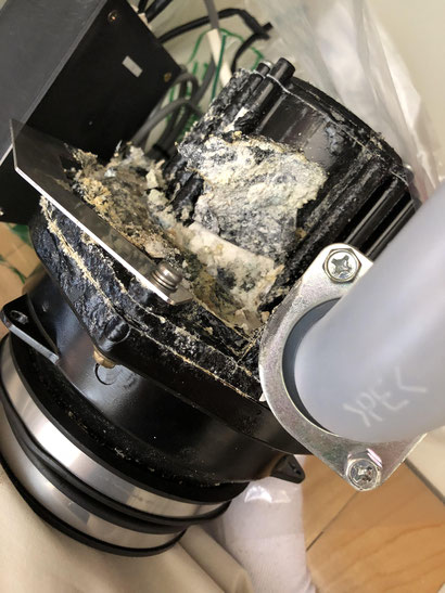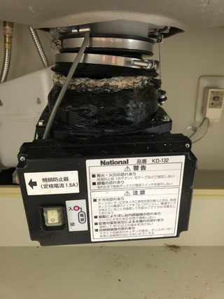 パナソニックディスポーザーKD-133になります。 スプーンが入ってしまい蓋が外れない…と言う修理対応になります。 蓋スイッチタイプのメリットもありますが今回はデメリットがはっきり出てしまった事例になります。 処理内部の回転盤と蓋の間に挟まってしまい取れなくなると言う症状です。 事例件数は少ないのですが蓋があるせいで内部の回転盤を押して回転盤の軸が曲がってします場合もあります。 年数に関係なく起こりうるトラブルです。 蓋スイッチタイプの「メリット、デメリット」をご理解したうえでディスポーザーの交換の場合は検討して頂く事をお勧めします。