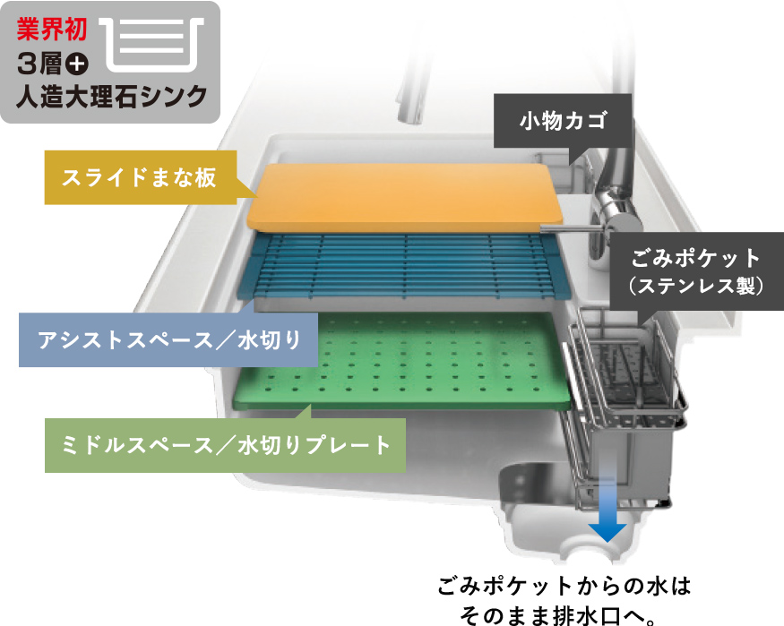 『アクリル人造大理石シンク』はシンクの特殊加工でディスポーザー設置可能です。
